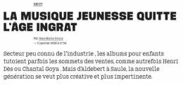 On ne va pas se plaindre quand un quotidien national propose un article sur la chanson jeune public. C’est si rare ! On aimerait quand même que les journalistes se renseignent un peu mieux sur leur sujet. Celui-là ne dit pas vraiment de bêtises, mais... à le lire , il n’existerait que deux artistes valables - j’ai nommé Aldebert et Vincent Malone. On connaît le succès que parents et enfants ont fait au premier et personnellement j’adore l’ humour à rebrousse-poil du second, mais où sont Alain Schneider, Steve Waring, Merlot, David Sire, Presque Oui... qui proposent des chansons tout aussi dignes d’intérêt - sans compter toute une création destinée à la petite enfance qui mériterait qu’on s’y attarde.